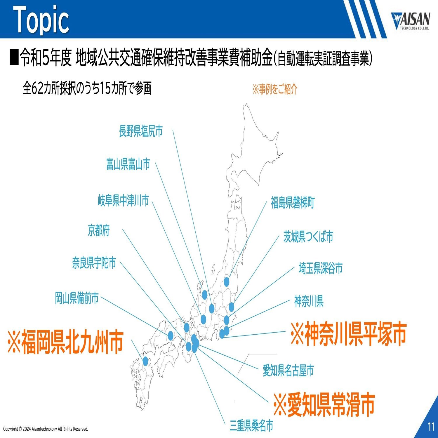 Q. 国が目標とする自動運転の公共交通の社会実装50~100ヵ所について、アイサンテクノロジーはどのように参画していく予定でしょうか。また、車両の提供や自動運転化のための改修などにも関わるのでしょうか。