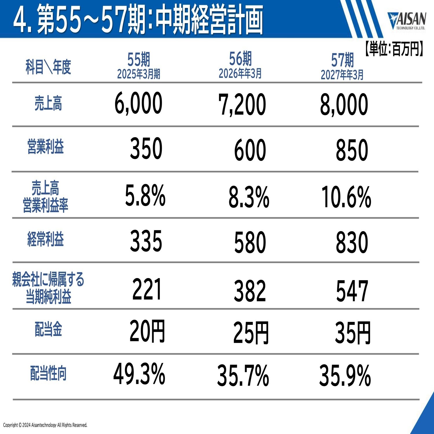 では次に、新しい中期経営計画として、55期から57期(2025年3月期から2027年3月期)の3年間の数字をご説明させていただきます。