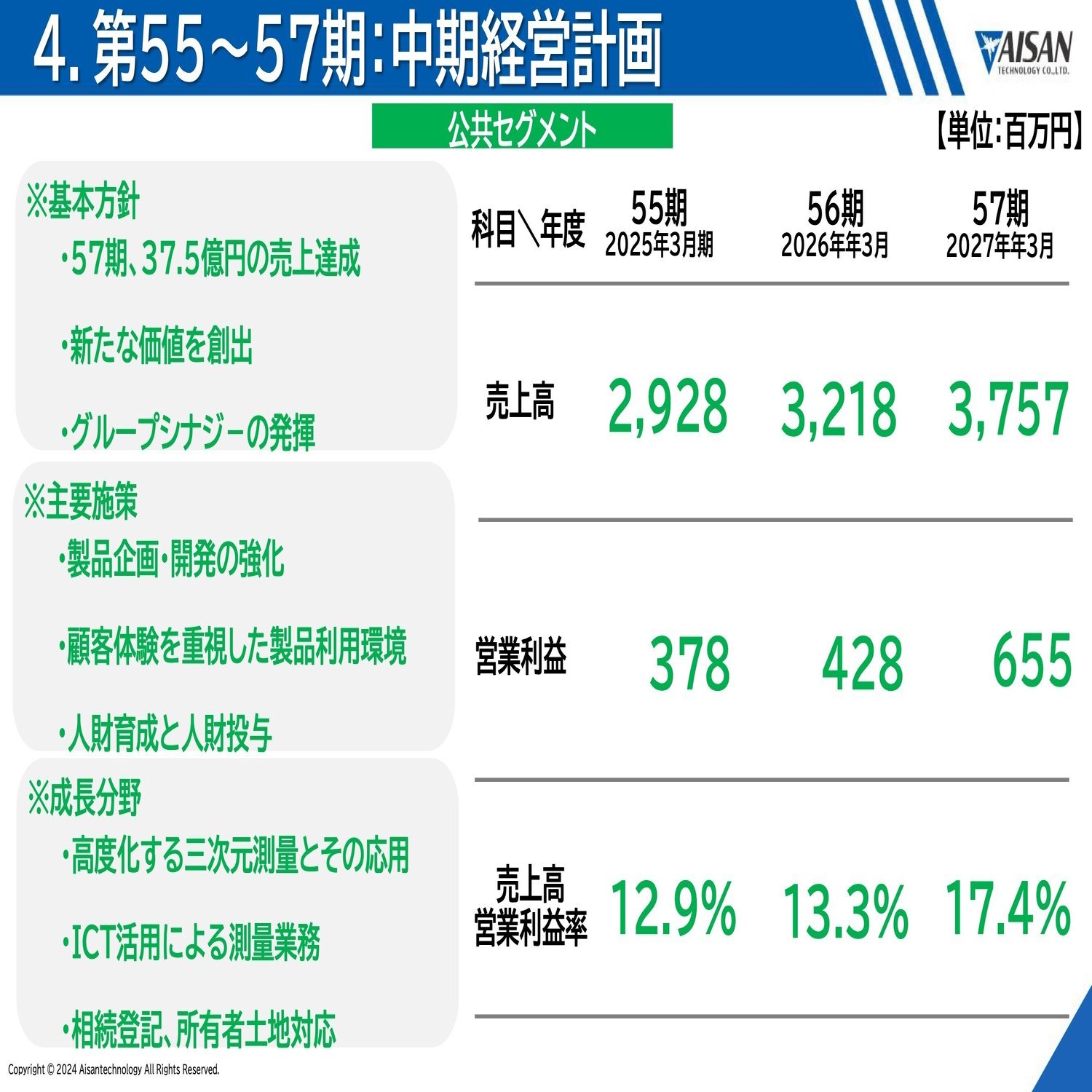 公共セグメントでは、方針、行動目標、成長分野に対して売上高、営業利益まで取っていく予定です。特にICTやテクノロジーを活用して人員不足や技術者不足を補いながら、業界全体を盛り上げていく動きが活発になってきます。