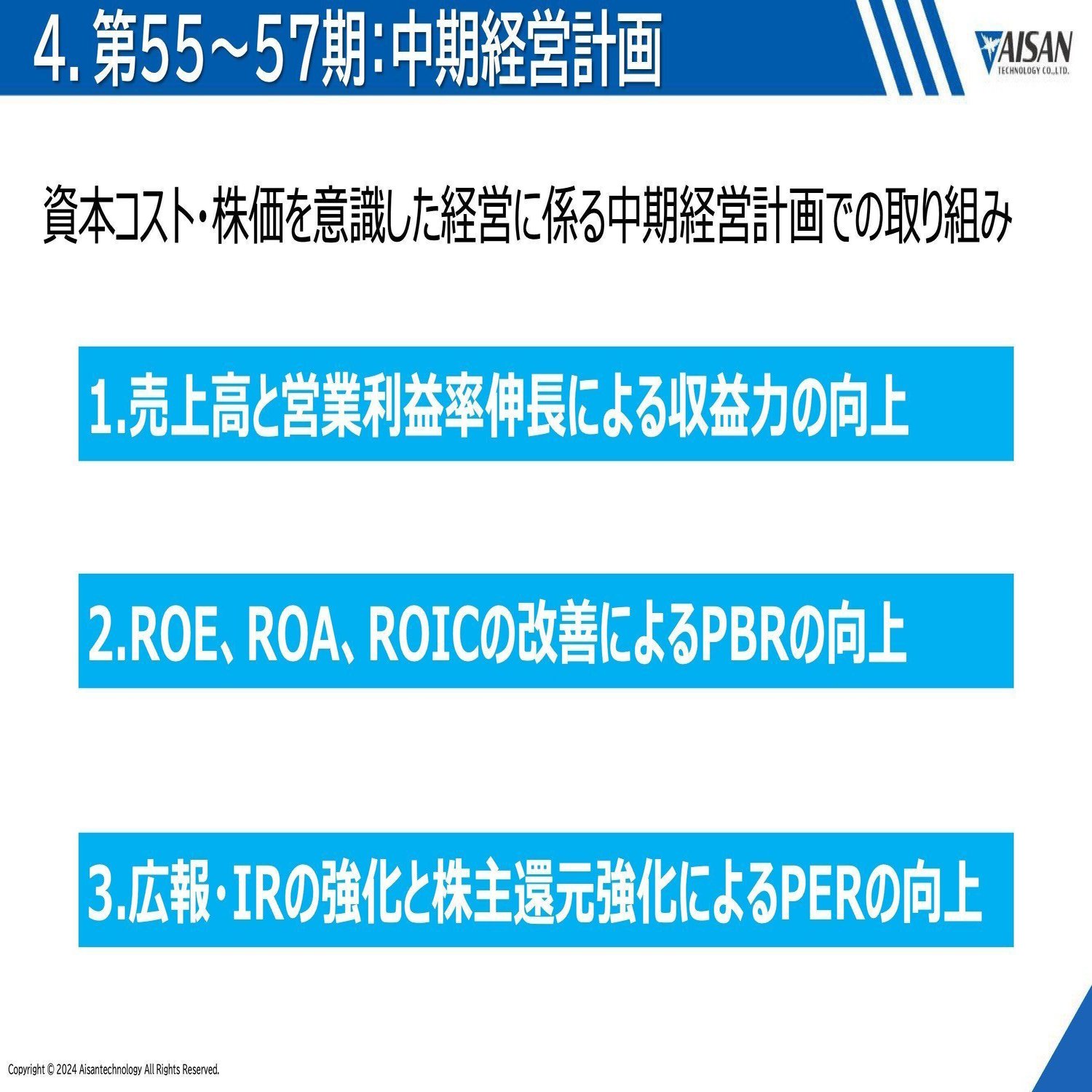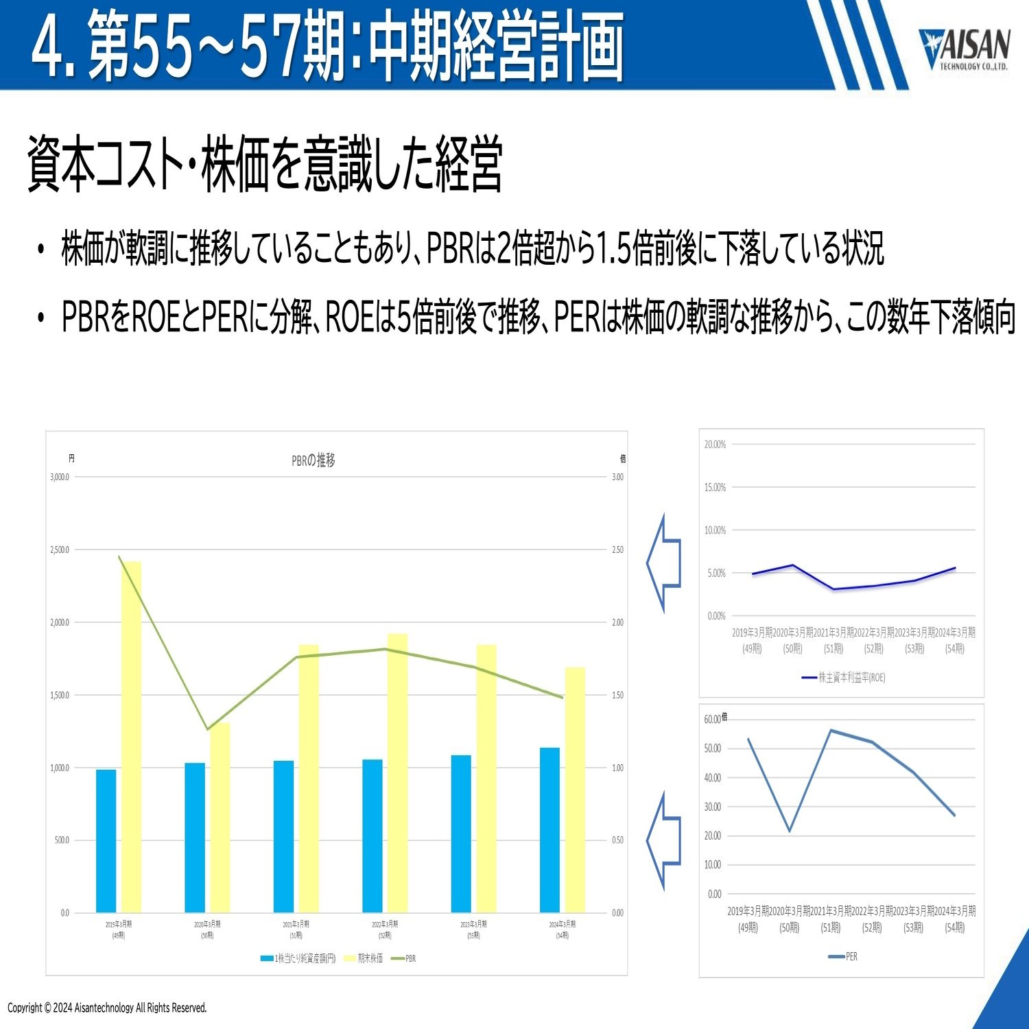 東証等からの要請で、資本コストや株価を意識した経営、PBR、ROIC、PERの改善等、具体的な指標を定めながら、この3年でしっかり現行より上がるよう努めたいと考えています。