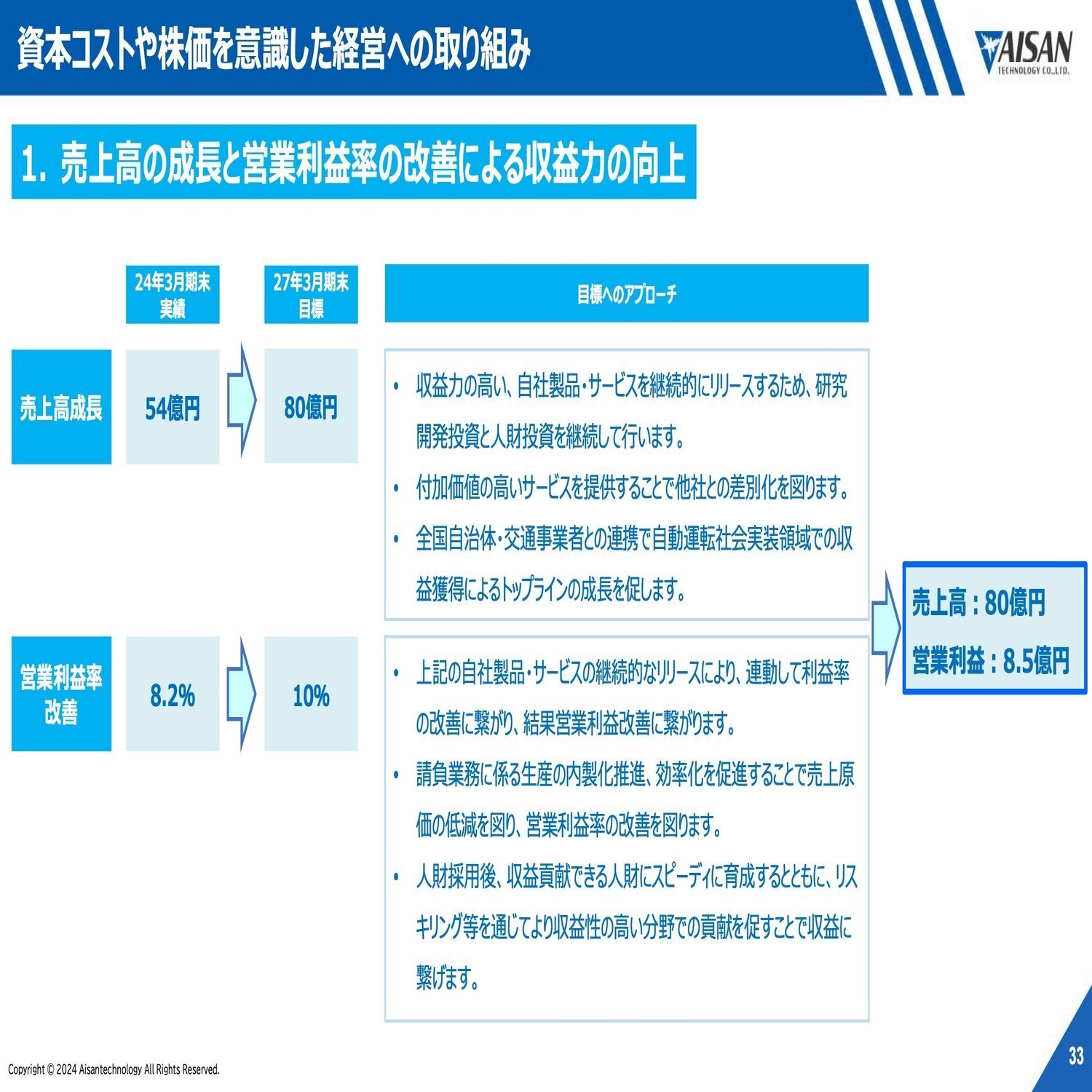 大きな3つの方針の中で、まず収益面では3年後に営業利益8.5億円を確実に取れるよう、体制づくりと製品開発に注力します。これをやり切れば、2番目の点は自ずとついてくると考えています。