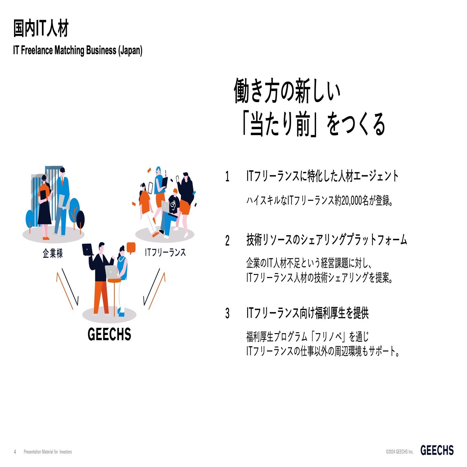 同時にこのITフリーランスと長くパートナーシップを持つというのが、このビジネスの肝になってきますので、彼らの仕事を探すだけに限らず、ITフリーランス向け福利厚生といった言い方をしておりますが、仕事を探す以外の周辺サポートをできるようなサービスを提供する取り組みもしております。