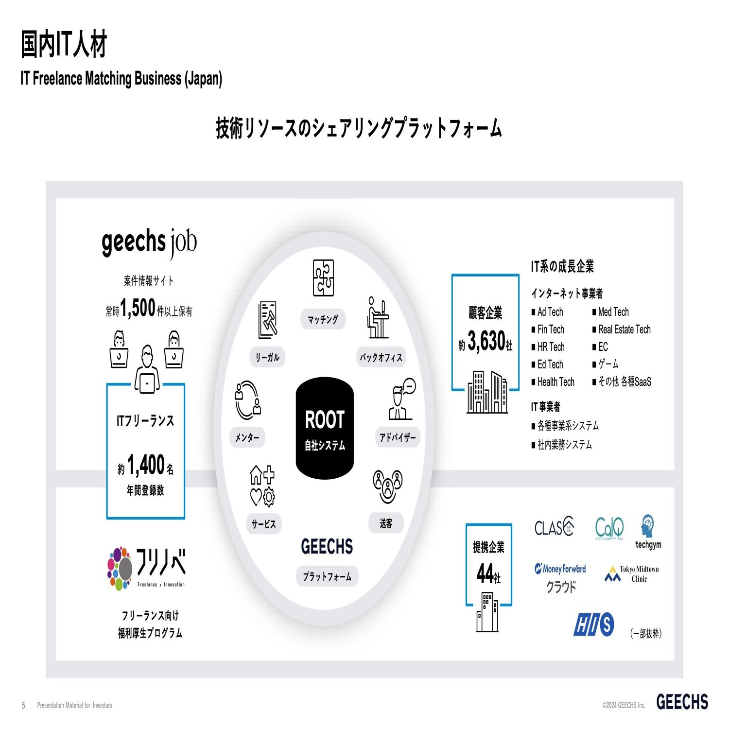 こういったフリーランスの方と、右側の顧客企業、過去取引があった企業3,630社ですが、IT人材を必要としている会社は、IT系の成長企業、インターネット系の会社で様々なサービスを提供している会社、あとはSIerと言われるIT事業者、各種業務系システムの開発を行う会社、こういった会社にIT人材は集中しています。