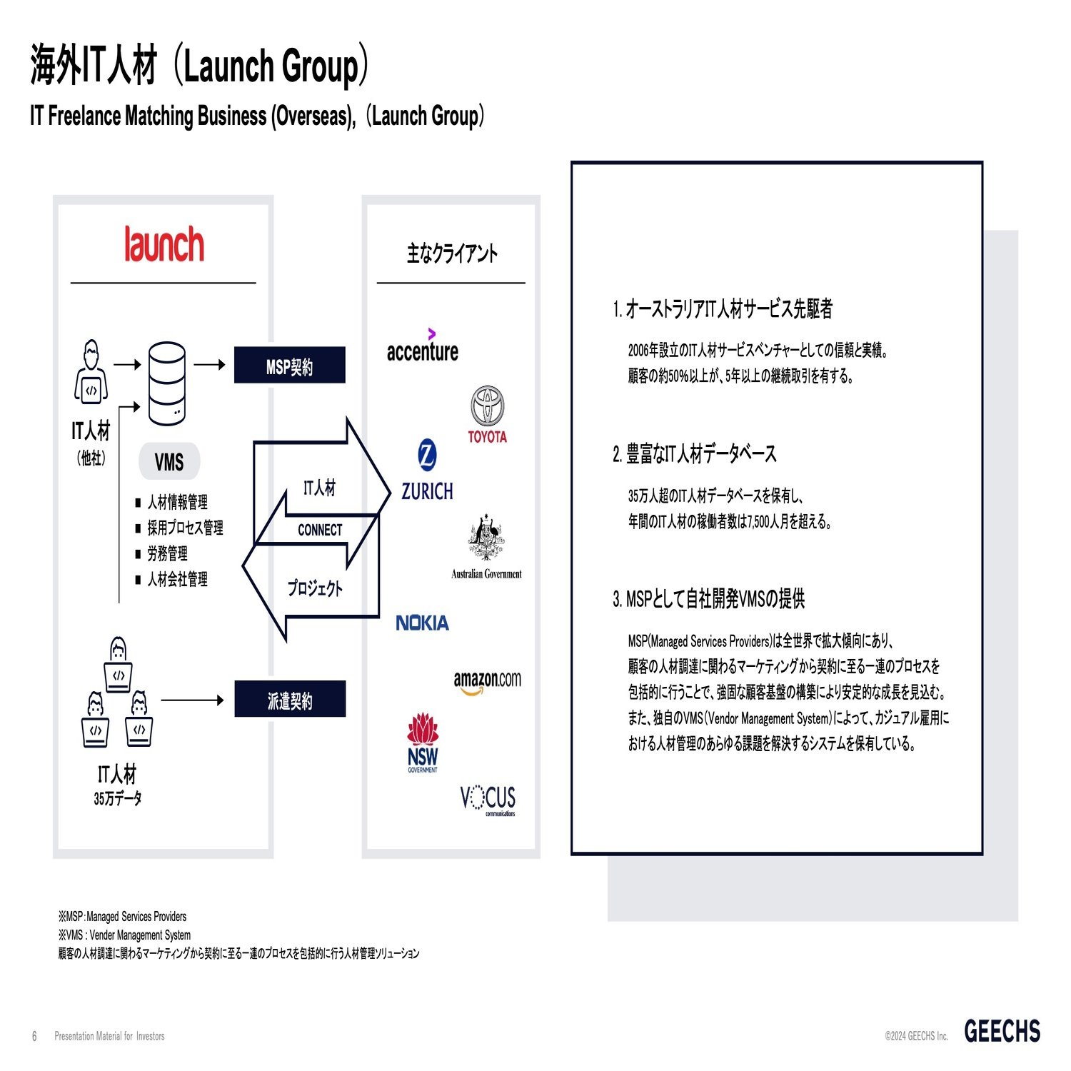 Launch社はオーストラリアで2006年に設立された会社で、年次としてはギークス本体のIT人材事業と同じぐらいになります。クライアントをご覧いただくと、日本の企業のトヨタもございますし、スイス生命やAmazon等、幅広くグローバル企業と取引をしております。以上がオーストラリアで展開しているLaunchグループでございます。