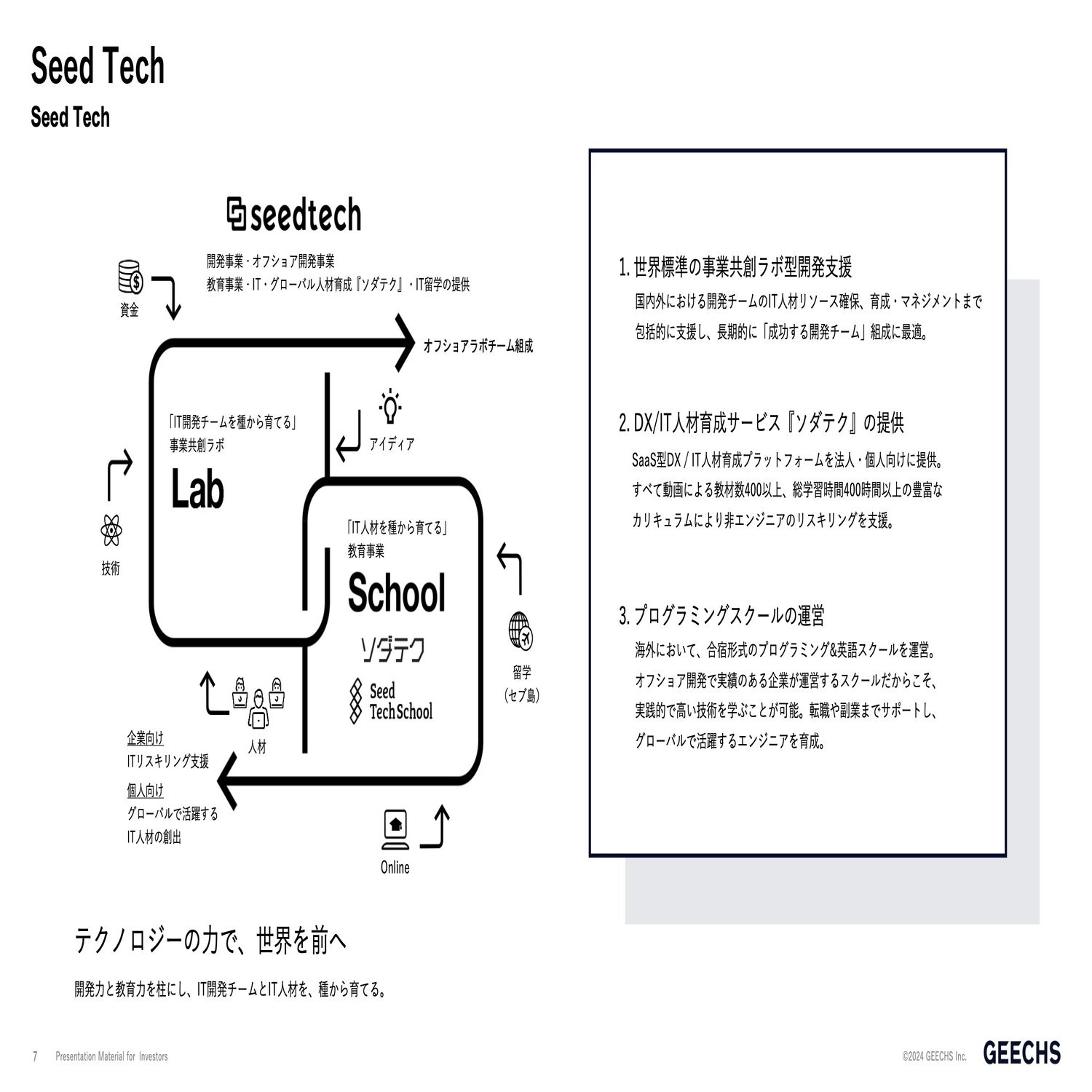 こういったオフラインの留学サービスも提供しております。英語も同時に学ぶことが出来ますので、場合によっては将来的にフリーランスになれば、いわゆる日本に限らず、いろんな拠点、世界にいながらいろんな仕事をオンラインで受けられる。このようなオンライン・オフラインでの人材育成でゼロからの非IT人材をIT人材に変えていく、ということを展開しているのがSeed Techでございます。