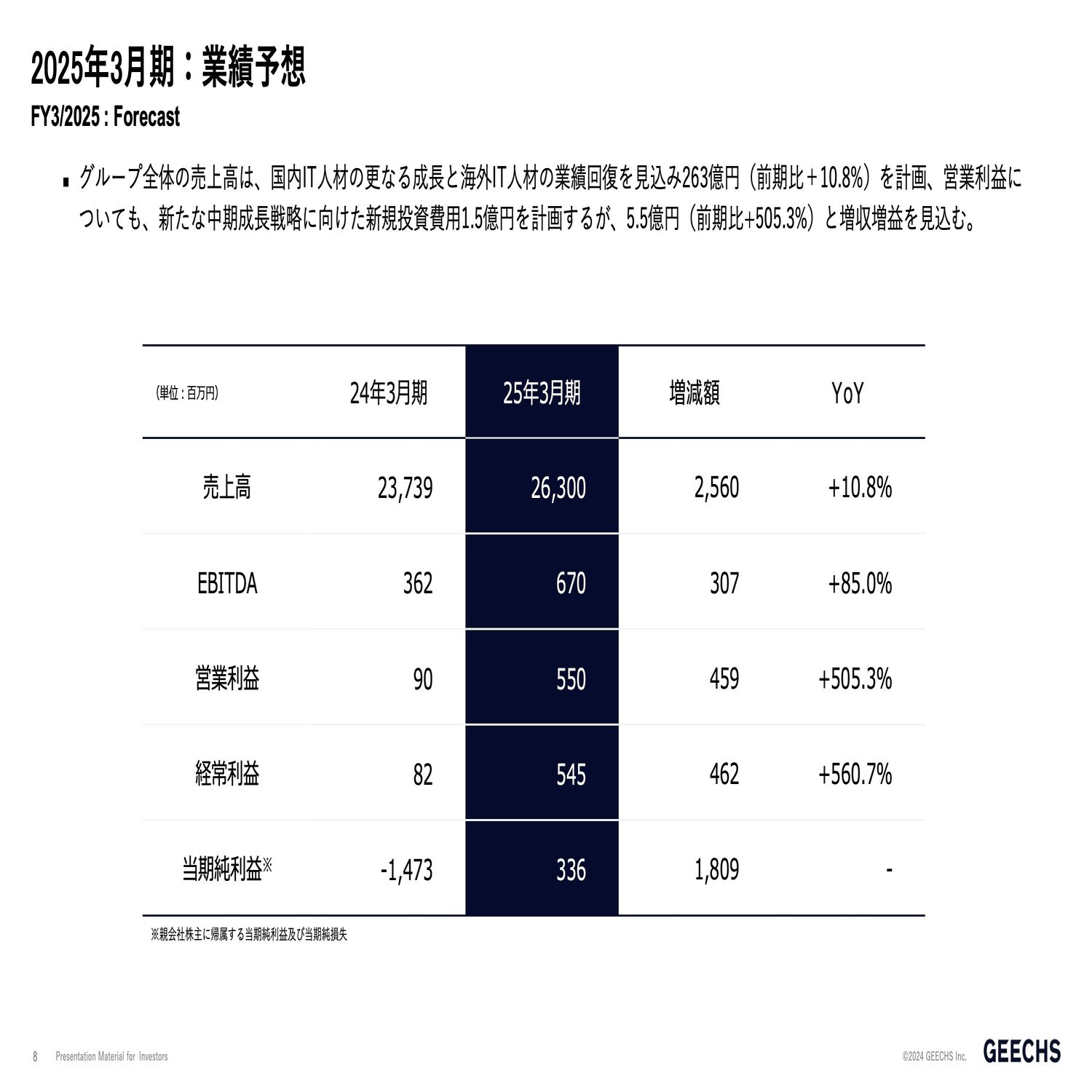 本日は遅い時間にもかかわらず、多くの方にご参加いただきましてありがとうございます。先ほど利益がもう少し出るのではないかというようなコメントがございましたが、現在、ギークスグループのポートフォリオを切り替えております。新たにIT人材領域でグループの立て直しを行う、その第1期が今期だと思っております。