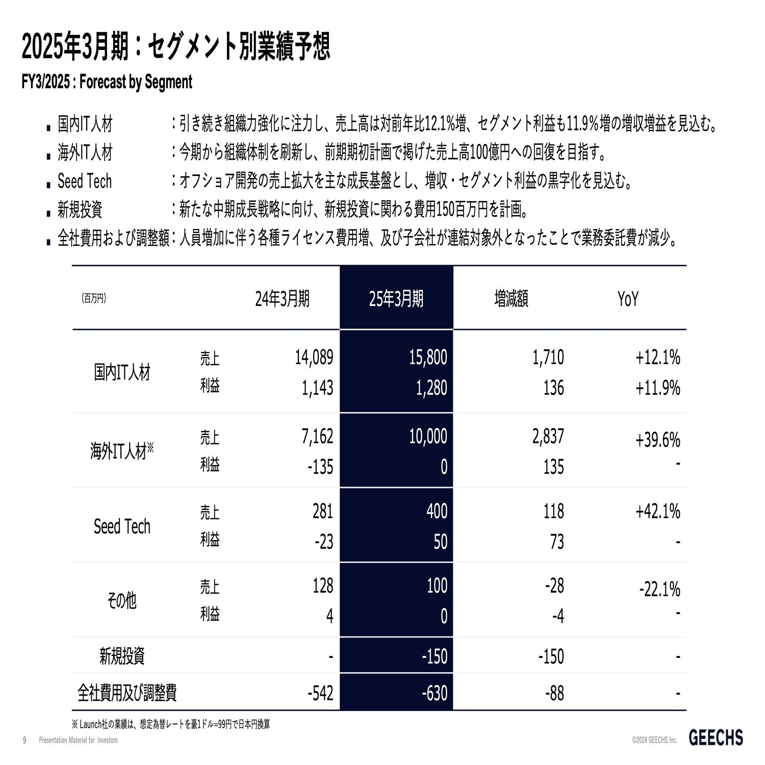 続いて海外IT人材です。Launchにつきましては売上高20億円で、前期と比較すると売上高は伸ばせておりますが、先ほど申し上げた通り、費用の発生がございますので、そういった影響もありセグメント利益がマイナスとなっております。ただこちらに関しても、現状のタイミングにおいて計画通りの数字でございます。