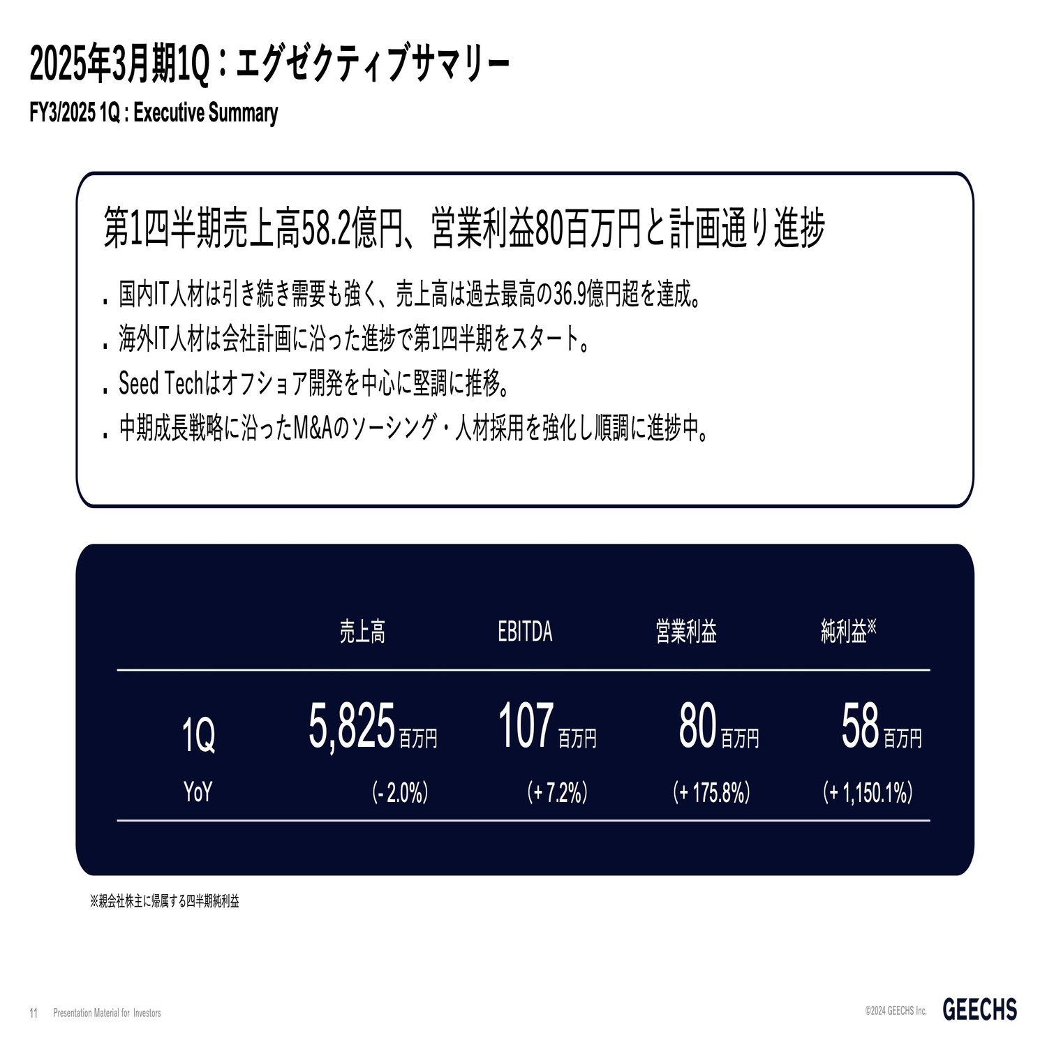 では25年3月期の第1四半期の決算についてご説明いたします。売上高は58.2億円、利益は8,000万となりました。四半期毎の計画は開示しておりませんが、社内の計画に対して、計画通り進捗しております。国内IT人材、海外IT人材ともに計画通りの数字で進捗しております。国内IT人材は、この四半期の売上高36.9億円は過去最高となりました。
