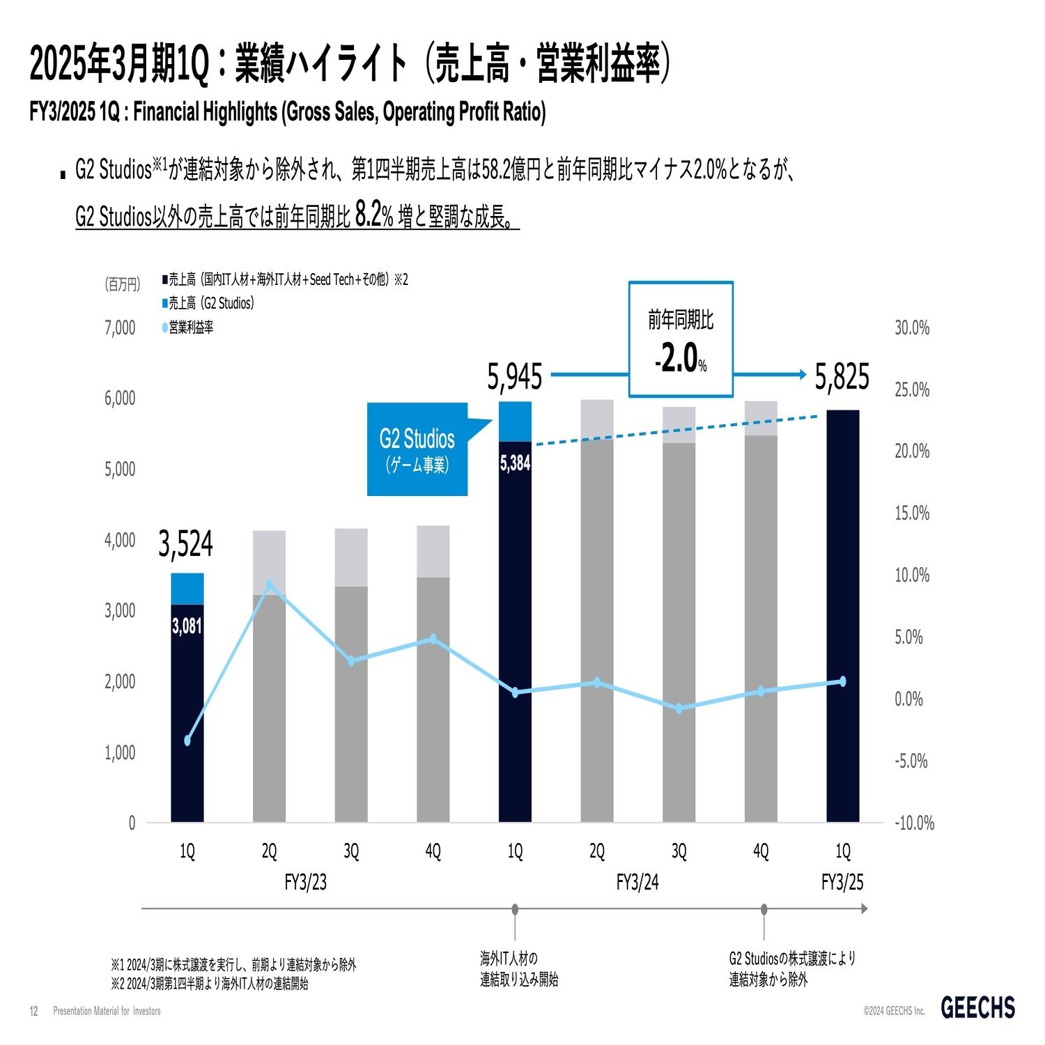 続いて四半期毎の売上高と営業利益の推移です。ここで一つご説明ですが、前期まではグループにG2Studiosというゲーム制作会社がございました。従業員約250名、外部人材が約280名の、スマートフォン向けのゲーム制作会社です。24年3月期の3月末時点で事業売却をしております。よって今期はゲーム事業の売上は計上されていません。第1四半期の売上高は、前年同期比マイナス2%となっておりますが、ゲーム事業の売上がなくなっていますので、前期の売上高からゲーム事業分を差し引くと前年同期比がプラス8.2%となり、売上高も伸びております。