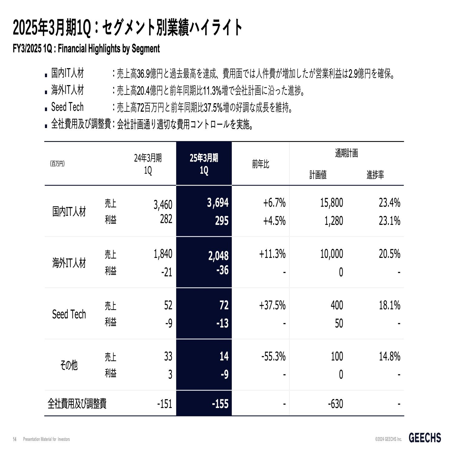 Seed Techについてもオフショア開発を中心に堅調でも計画通り推移しているという状況です。中長期的な戦略に沿ったM&Aやソーシングについては、まだこの第1四半期では先ほどご説明した1.5億円は活用しておりませんが、ソーシングや人材採用を進めていい形で進んでおりますのでこちらも順調に進捗中でございます。