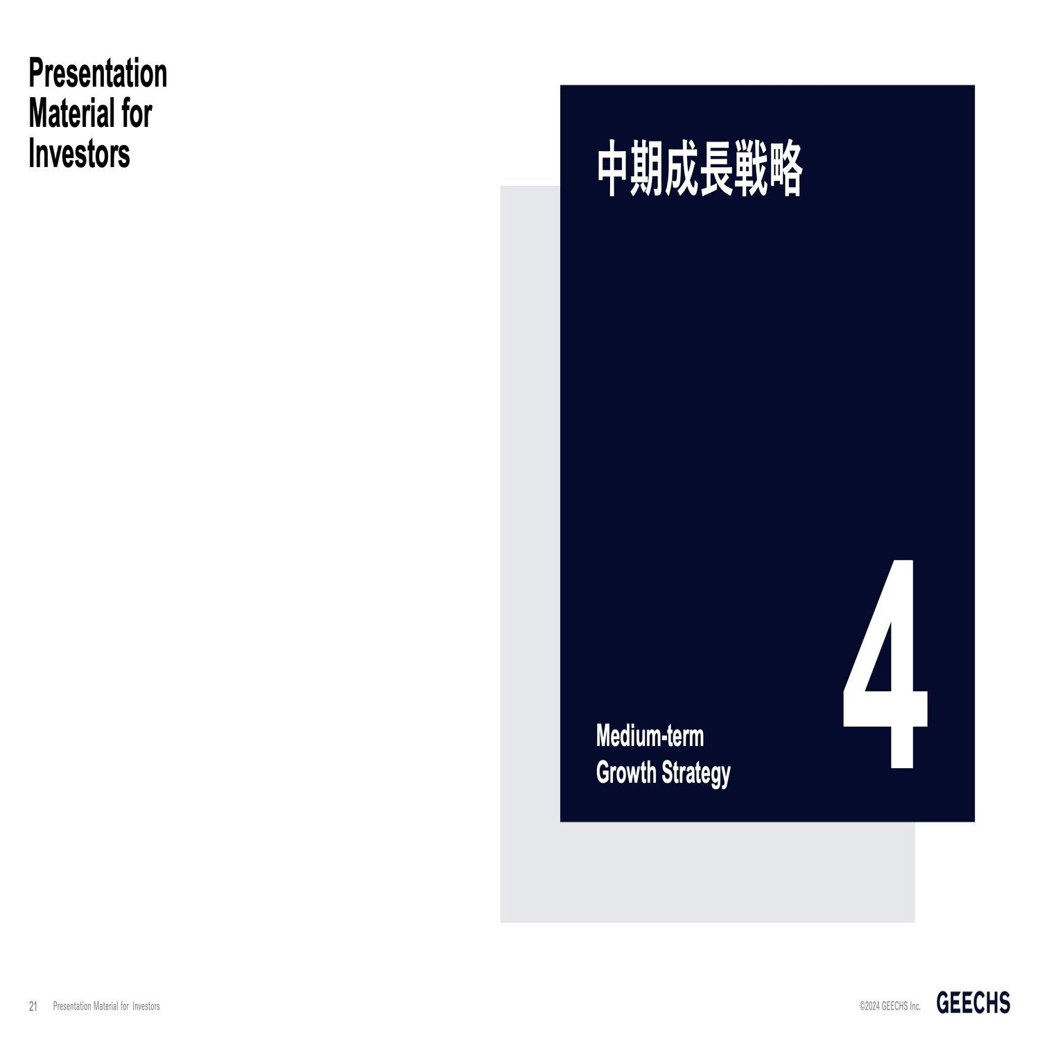 ここまでが第1四半期の弊社の業績になります。ここから中期成長戦略というスライドを入れております。先ほどのご説明の中でゲーム事業の売却があったと申し上げましたが、現在ギークスグループの一つのターニングポイントでございます。以前は中期経営計画を公表しておりましたが、ゲーム事業の売却などもございましたので、一旦計画は取り下げさせていただいております。事業ポートフォリオを変えていくタイミングで、新たにギークスグループで現在持っているアセットにプラスし、どのようなことを展開していくのかについて少し触れさせていただきます。この辺りの計画が走り出したら中期経営計画を形にしてお渡しできたらなと考えております。