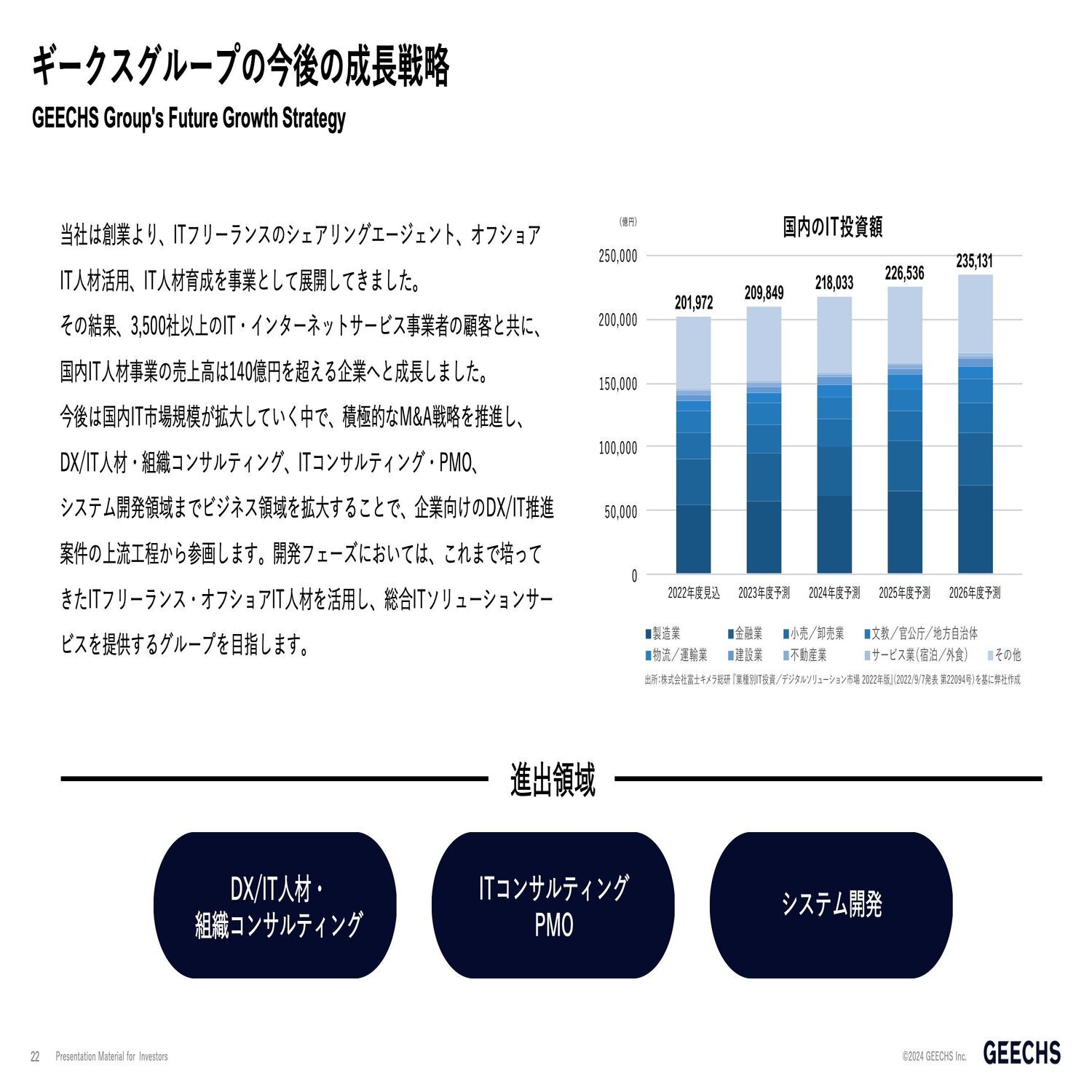 ここから先は更なる成長に向け、今回のポートフォリオの切り替えによってどこを目指すかと言うと、積極的なM&Aや、社内で一からの事業創出、人材を採用しての事業創出、様々な形をとりながら事業会社のDX/IT人材、また組織コンサルティング、ITコンサルティングである等、こういったシステム開発における上流領域を目指します。これまでの人材供給領域から上流のレイヤーをギークスグループの中で担っていこうと考えております。